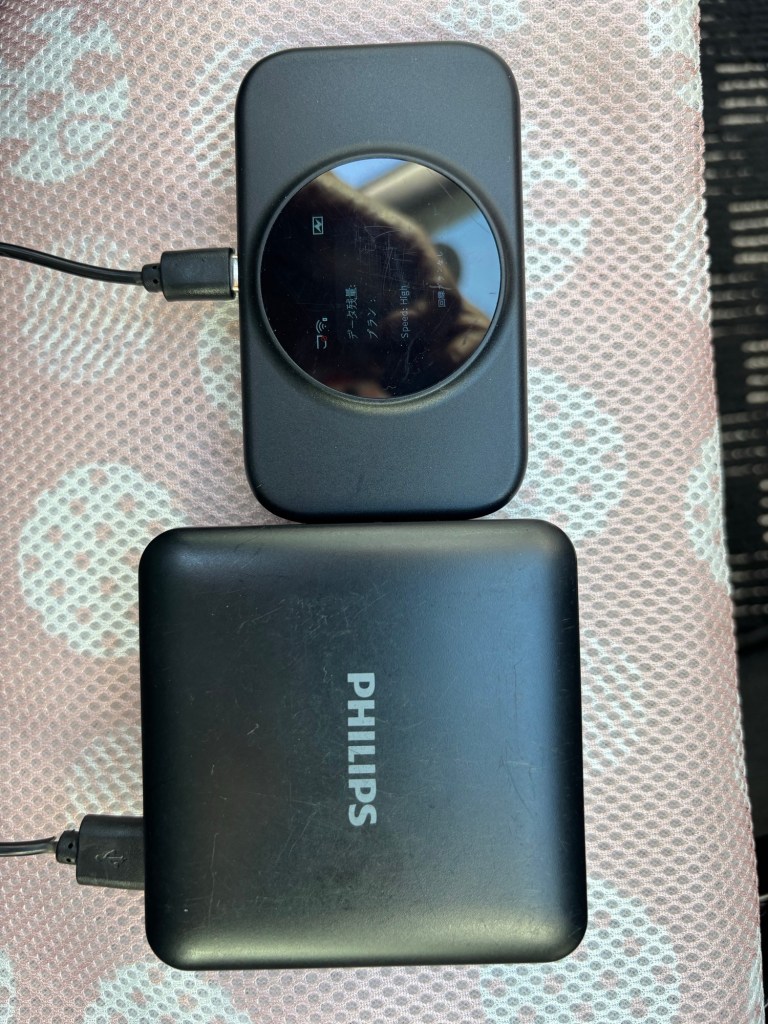 車から出る時は、やはりAmazonで購入したPHILIPSのモバイルバッテリーに繋いでバックに入れて持ち歩いています。